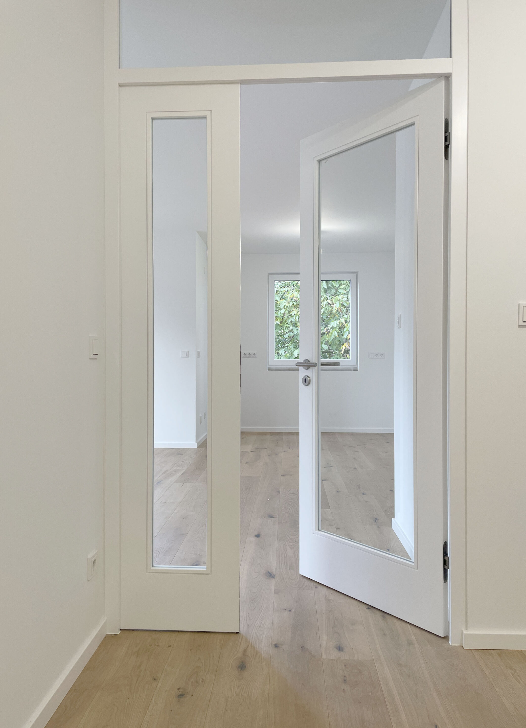 - stumpfeinschlagende Holztüren mit glatter Oberfläche und passender Rosetten-Drückergarnitur des Herstellers Hoppe Modell Amsterdam