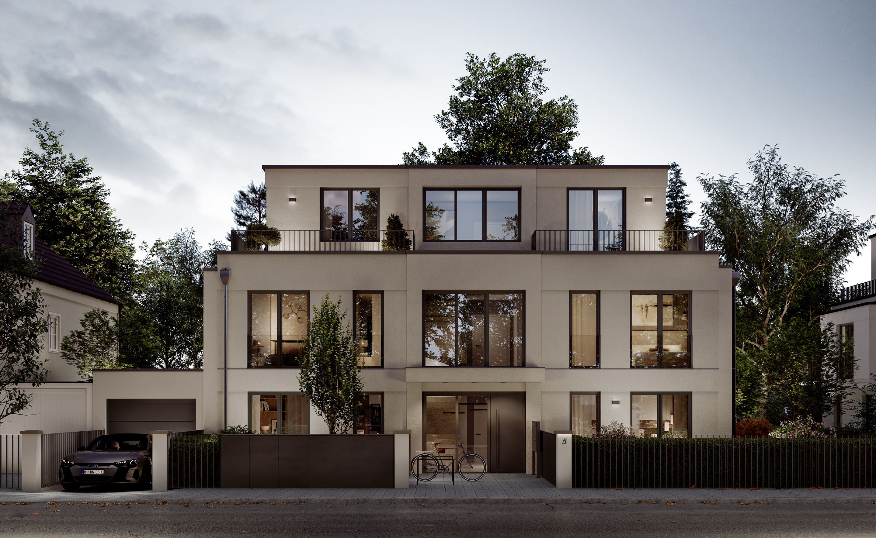 Die Architektur dieses Mehrfamilienhauses ist eine Hommage an die klassische Moderne und fügt sich selbstbewusst in die exklusive Nachbarschaft ein. Die symmetrische Fassade mit eleganten Gesimsen verleiht dem Gebäude zeitlose Eleganz.