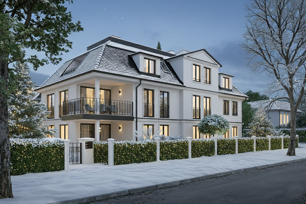 Die stilvolle Architektur fügt sich harmonisch in das Villenviertel ein und bereichert das ruhige Wohnumfeld um eine hochwertige Neubauimmobilie.